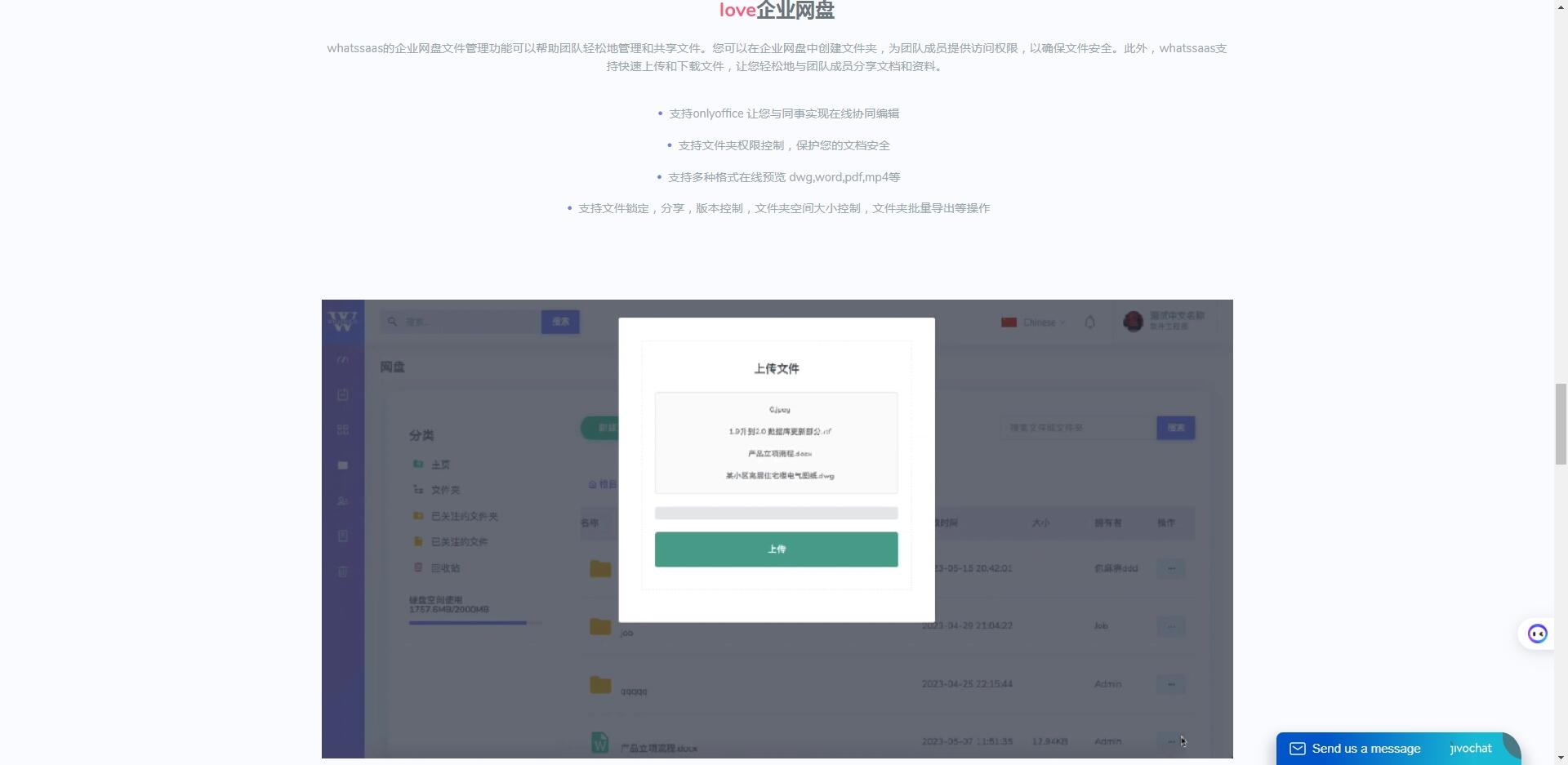 whatssaas的企业网盘文件管理功能可以帮助团队轻松地管理和共享文件。您可以在企业网盘中创建文件夹,为团队成员提供访问权限,以确保文件安全。此外,whatssaas支持快速上传和下载文件,让您轻松地与团队成员分享文档和资料