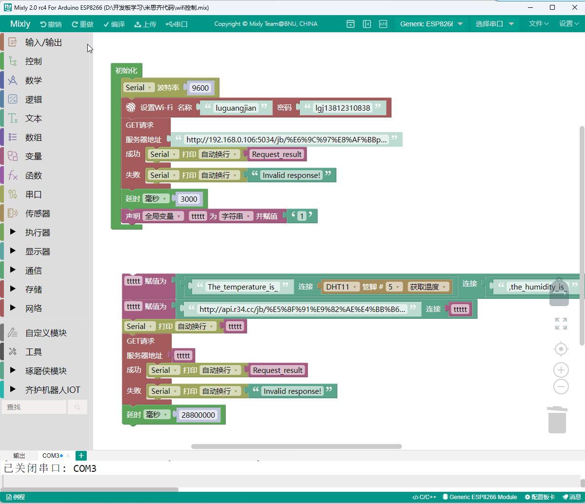 学了点皮毛esp8266也挺好玩的。 esp8266可以自动用mixly可视化编程,我虽然不会代码,但也可以拖出一个小成品出来。我读取出温度、湿度,然后再通过自己的接口发到自己的邮箱。 考虑做一个太阳能的自动气象站。