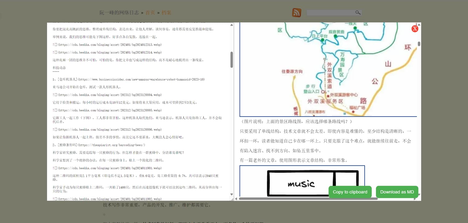 Markdown 预览:转换后,将出现一个模态框,显示你选定的网页元素的 Markdown 转换结果。同时可以编辑 Markdown 并查看实时预览。