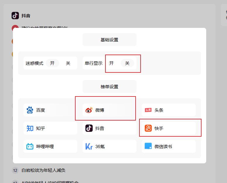 - 榜单设置的按钮是可以进行拖拽的,也可以进行启用和禁用操作,这样就可以选择自己需要的信息。