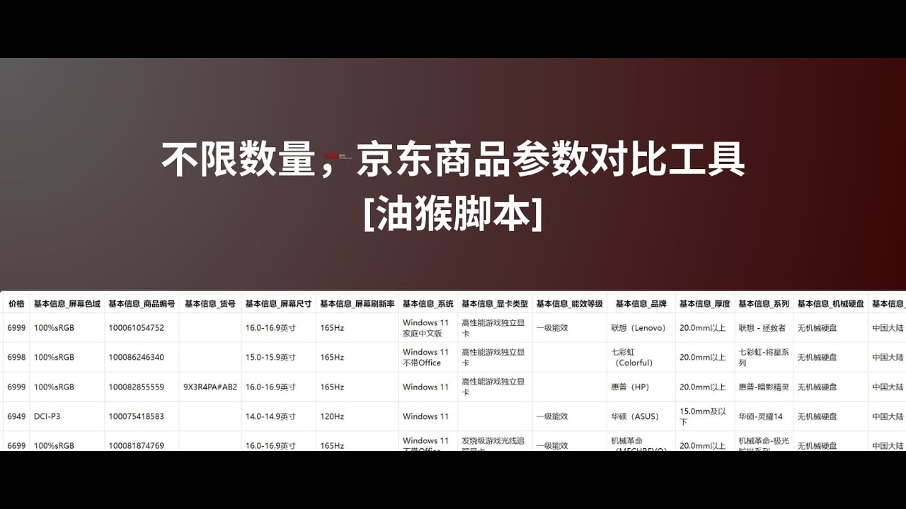 京东商品参数对比工具是一款针对京东网页版的油猴脚本,它可以不限数量的对比商品参数,并以表格的方式展示出来,方便用户比较不同商品。可导出 .csv 文件。@Appinn