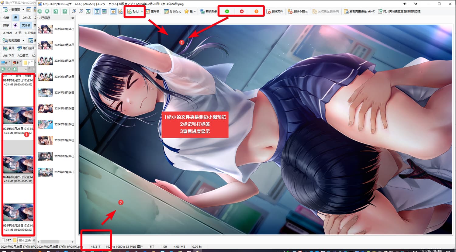 试过其他的免费的图片浏览器,都没遇到符合要求的,显示图片序数算是小众功能了,标记而不“打标签(以分类/分级/设关键词)”更是小众中的小众功能……收费的没试……