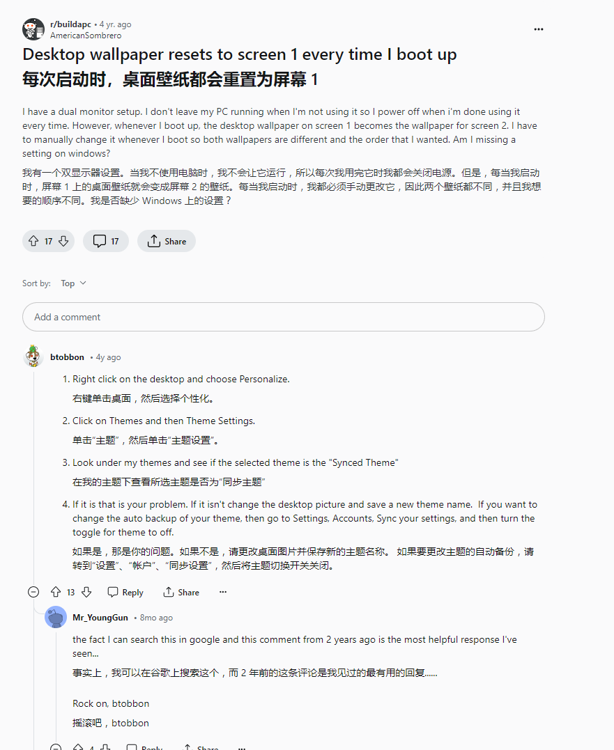 但电脑重启后失效,2个背景壁纸变成一样的了,包括设置的适应模式也会失效