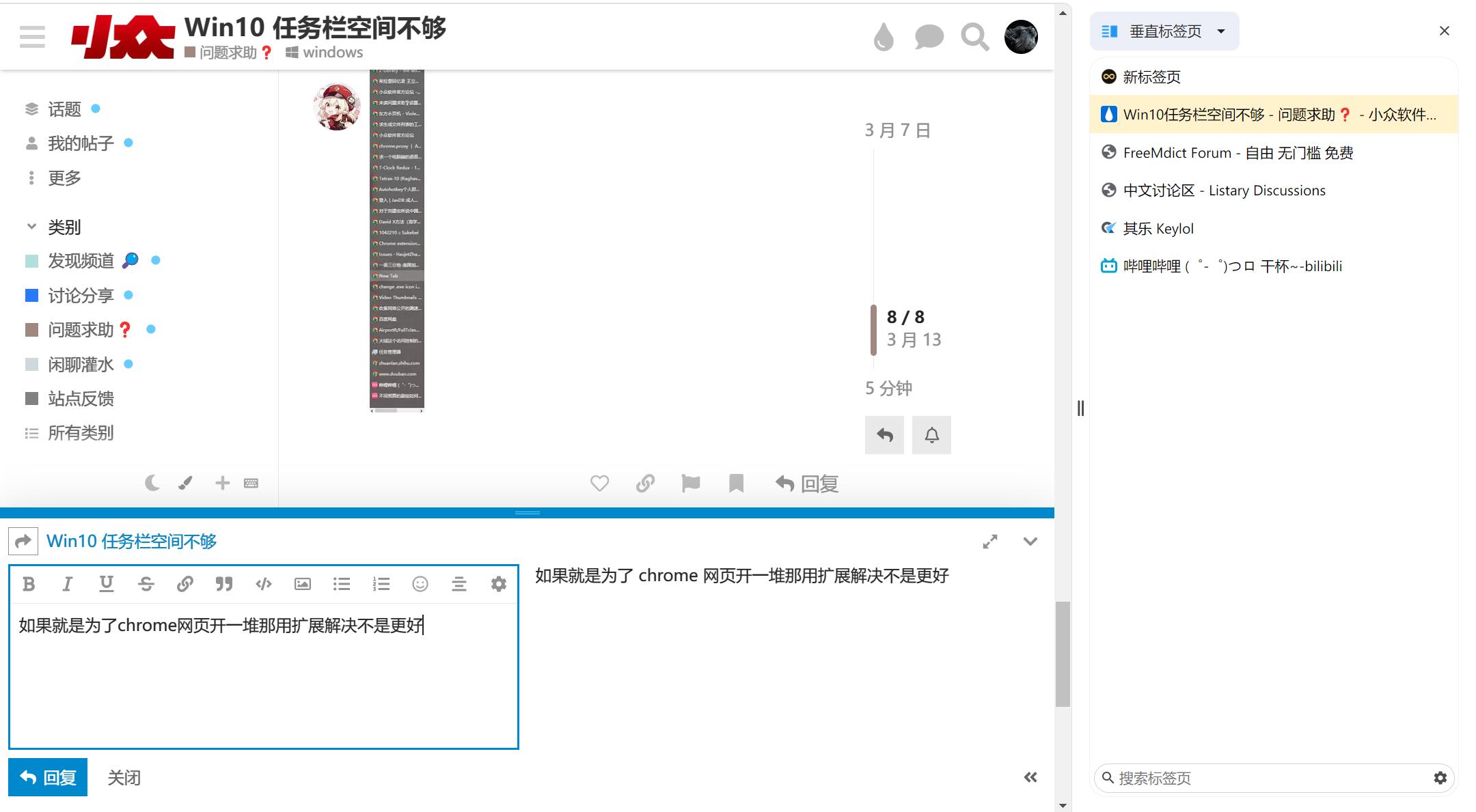 不太理解这种用法,浏览器有标签栏,用垂直标签栏就好,好像没必要硬塞任务栏。用垂直标签页+4k显示器,可以放56个标签。还不够就多开一个窗口,又是56个标签。