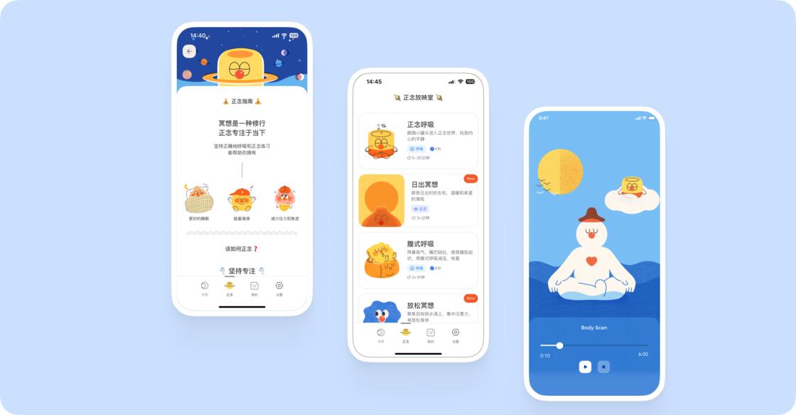 这些特别设计的角色和呼吸练习,为用户提供了在不同情境下的具体实践,更能帮助大家理解和接受,将冥想更好地融入到日常生活中。