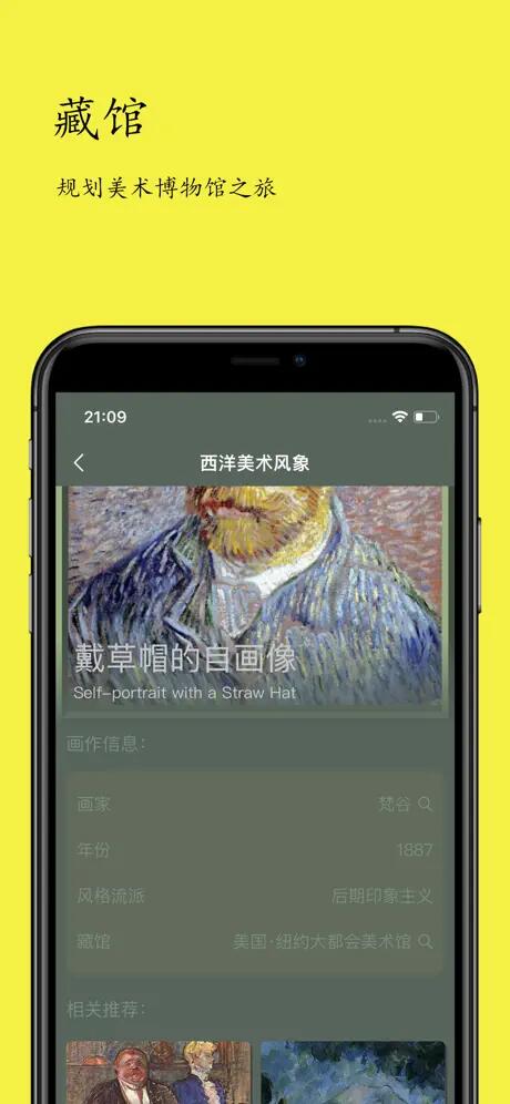 用户可在画作详情页面下拉显示iOS应用审美标语及中英切换按钮,点击画作图片可全屏查看画作,再次点击则返回画作详情。向上滑动页面的话依次显示画作的中文名、英文名、画家、创作年份、风格流派等信息,最后是相关推荐部分,随机推送相同风格流派的画作图片。