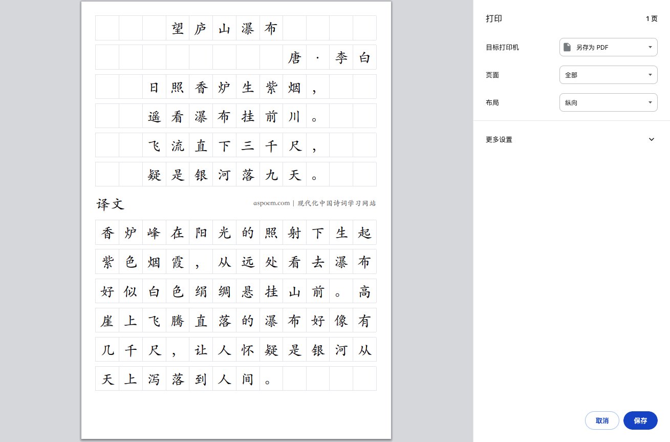 打印的网页展示,可以选择拼音、译文、边框