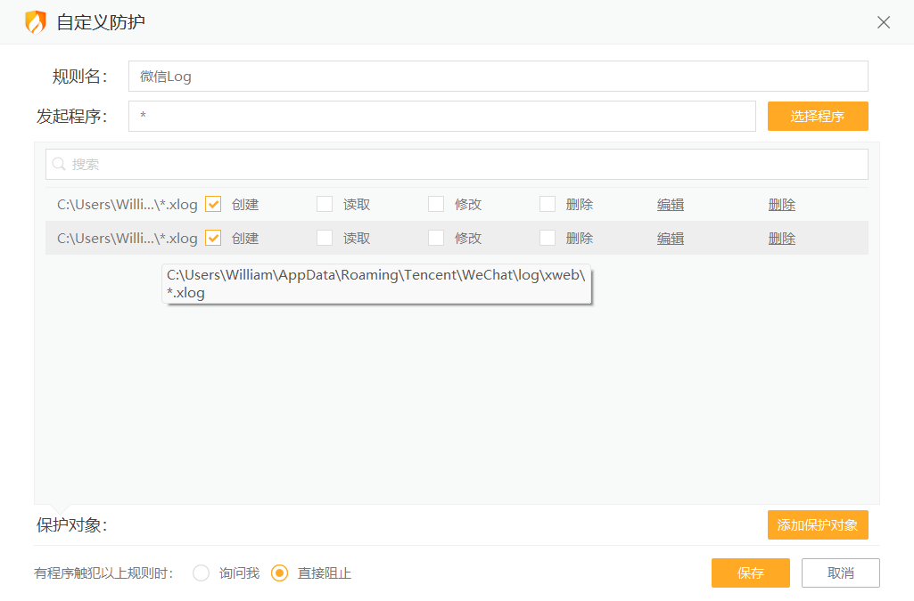 高级防护 - 自定义防护, 发起程序可以选择* ,点上禁止创建/修改, 询问我和直接阻止中 选择直接阻止 以后就不提醒了. 可以参考我这个