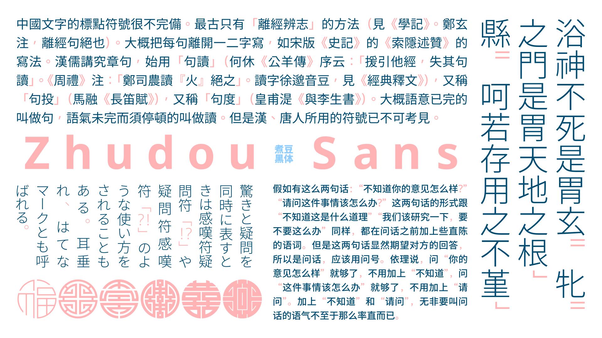 煮豆黑体是奈白不弍开发的衍生自 Noto Sans 和思源黑体的标点符号字体家族,支持中日韩标点、全角字母、全角数字及一些特殊符号。标点造型主要来源于 Noto Sans,可以为类似风格的西文字体带来更加协调的中外文混排效果。
