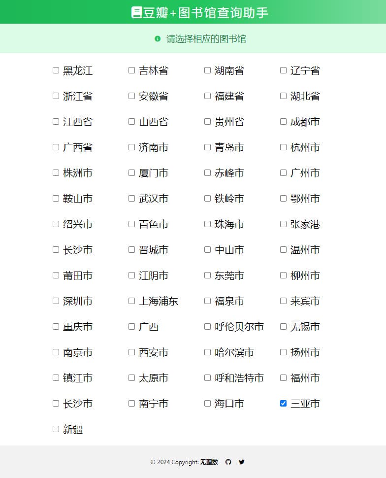 新增支持南京市、西安市、哈尔滨市、扬州市、镇江市、太原市、呼和浩特市、福州市、长沙市、南宁市、海口市、三亚市、新疆维吾尔自治区图书馆 2024-4-2