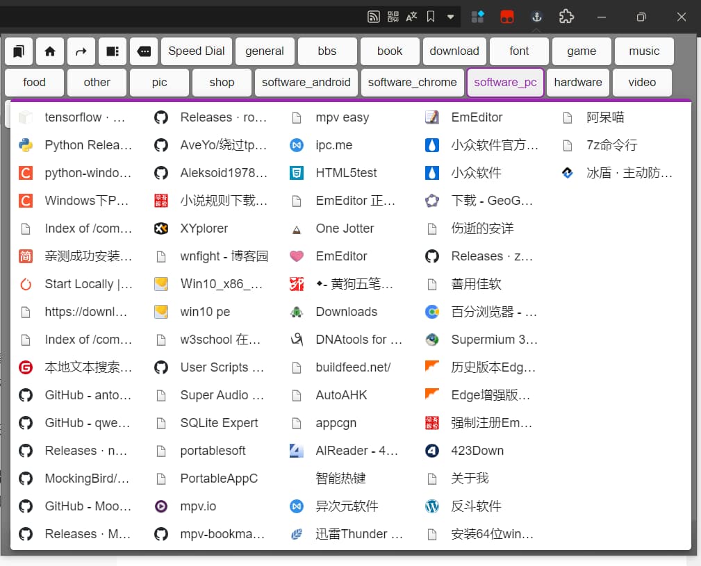 还有这个,在小众软件里面找小众软件系列2 感觉功能更好一些,功能也更丰富一些, 支持弹出窗口,标签页,侧边栏3种展示方式的书签插件 弹出窗口支持横向多列展示