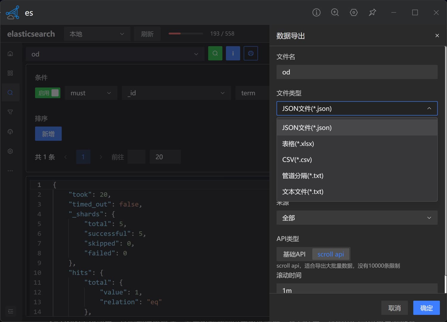 数据导出是es-client的又一个亮点。它支持多种格式的数据导出,包括JSON、CSV、TXT等。这使得用户可以方便地将查询结果导出到自己需要的格式中,便于后续的数据处理和分析。