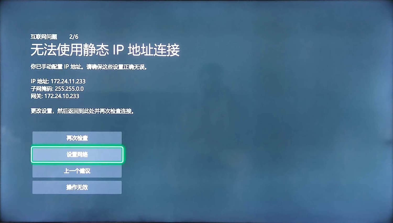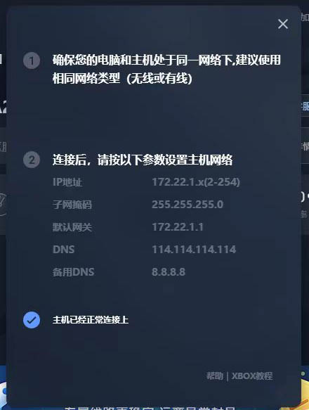 另一种是网关地址和终端地址给出来的是跨了一个子网段的(即子网掩码为 255.255.0.0 的)就都连不上,不管加速器是否显示主机已经连接上,XBOX上都连接失败。比如:Windows上运行加速器之后出现的网关地址是 172.24.10.233,XBOX上设置为 172.24.11.233 之类的。如下图: