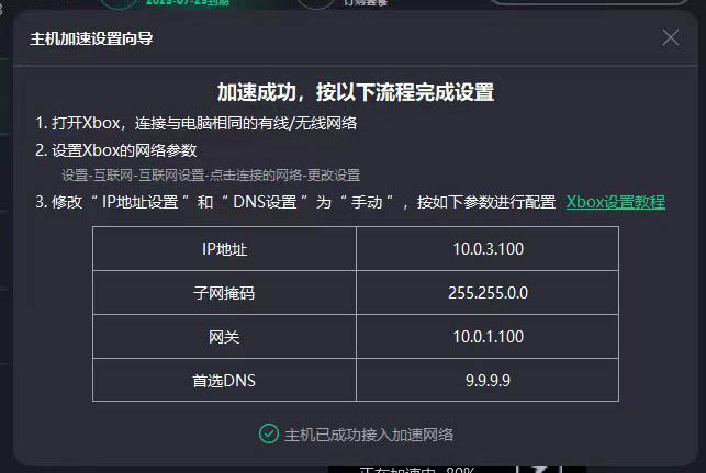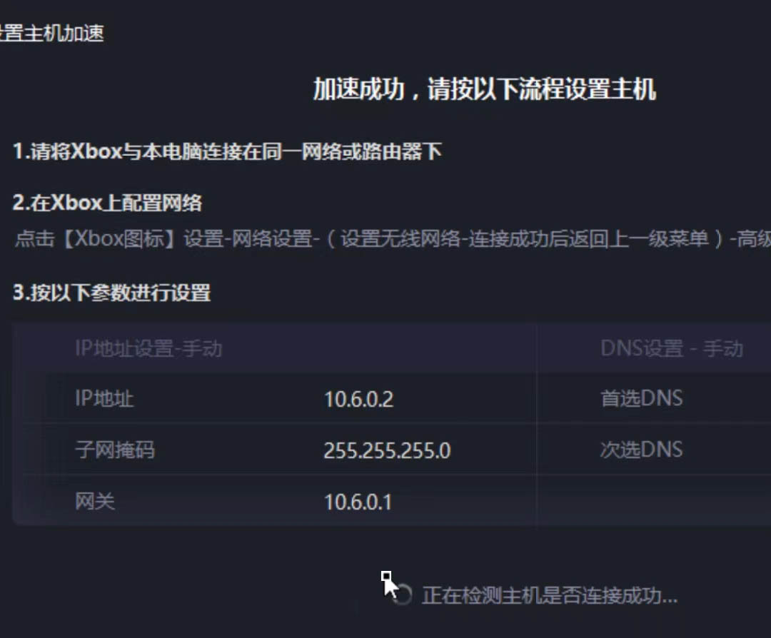 一种是网关地址和终端地址给出来的是在同一个子网段的(即子网掩码为 255.255.255.0 的)就都正常使用。比如:Windows上运行加速器之后出现的网关地址是10.6.0.1,XBOX上设置为 10.6.0.2 之类的。如下图: