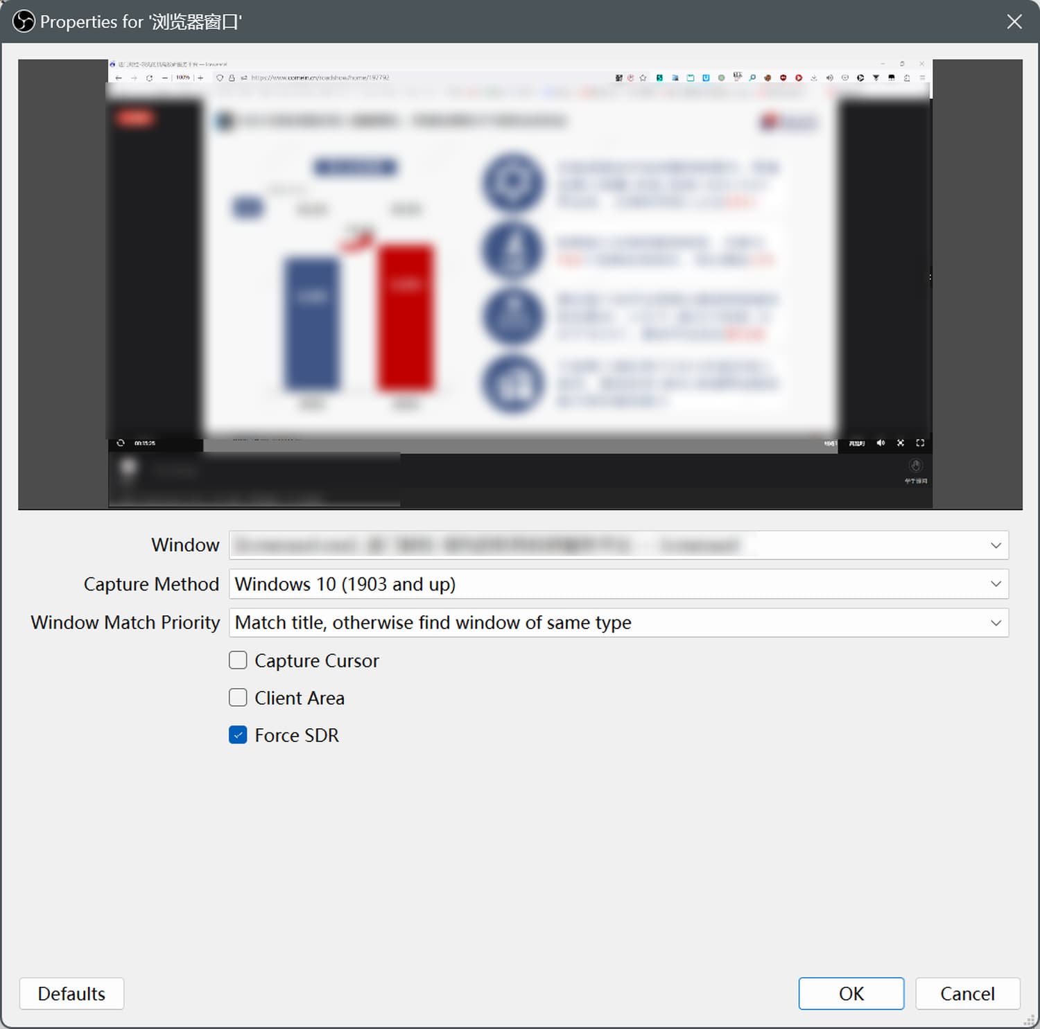 但OBS录浏览器窗口的时候发现,如果浏览器窗口被另一个最大化的窗口挡住,那么视频画面就停住了,不再变化。