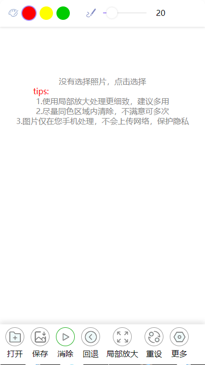 这是一个安全,永久免费,不限制次数的 图片去除水印的小程序,可以去除图片上的任何一个东西,不仅仅是水印。而且,图片不会上传到服务器,完完全全保护你的隐私。第一次进来时会下载一个模型文件就可以了。