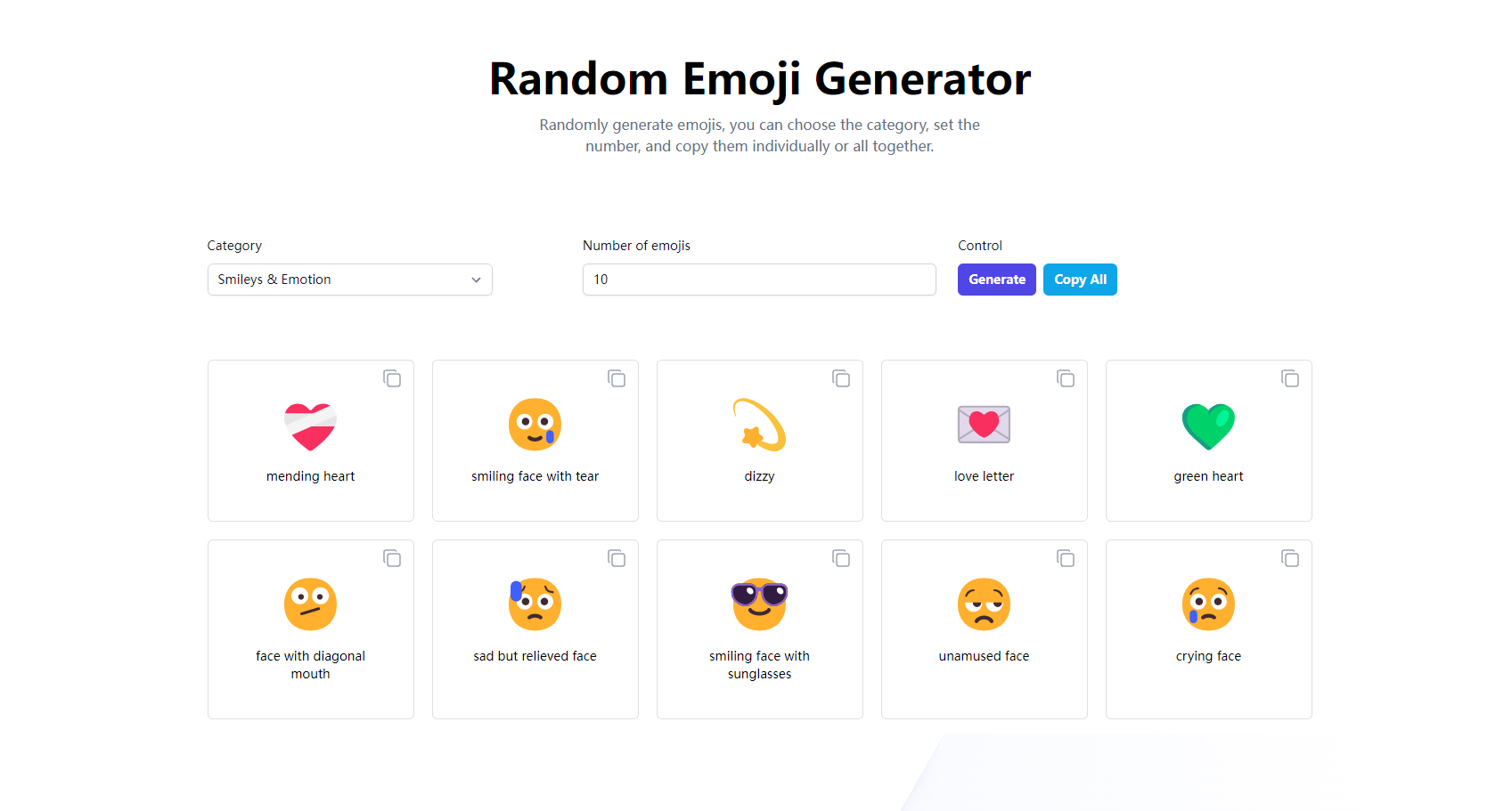 一个带有 5000+ emoji 的随机生成或搜索工具,可以设置生成的 emoji 数量,同时可以选择自己喜欢的 emoji 种类。如果不想随机生成,该工具还提供了关键字搜索功能,让你能够找到心仪的 emoji。