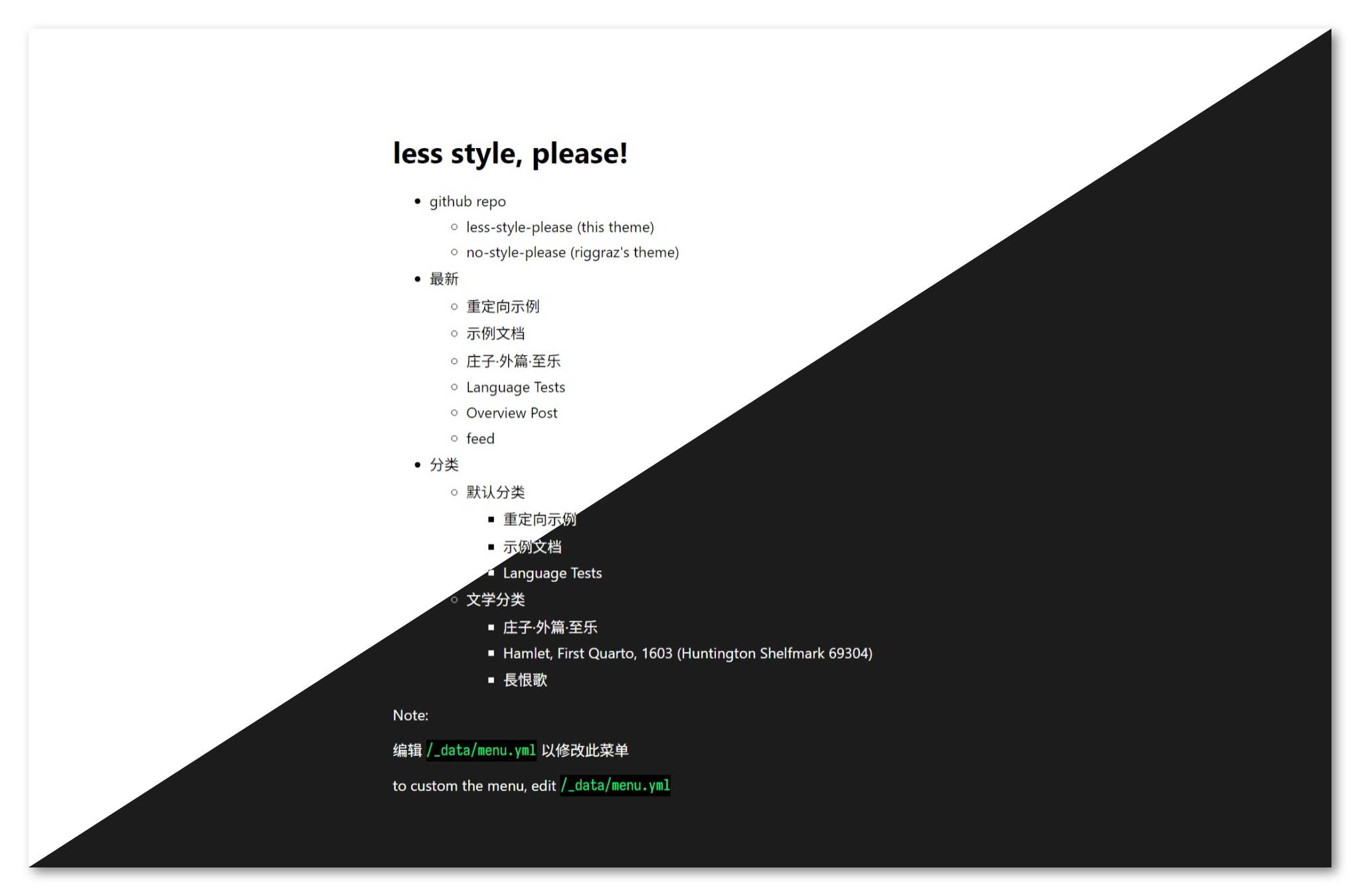 搬完内容自然就是折腾主题。找到一个rigggraz制作的no_style_please主题,非常接近我GH Pages原来的结构,以它为蓝本,逐渐修改成我需要的模样。