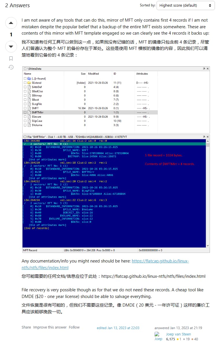 我这次遇到的问题是本来dg已经能提取所所有的好数据,完全可以以此修复受损的那部分$mft,但是它没有这个功能,就是现在已经掌握了所有的数据和大部分完好的索引,现在要根据这个数据和部分索引修复或者重构一个完整的索引,dg不行,所以我推论出可能的两个原因:1.作者能力不太行 2.作者不想做