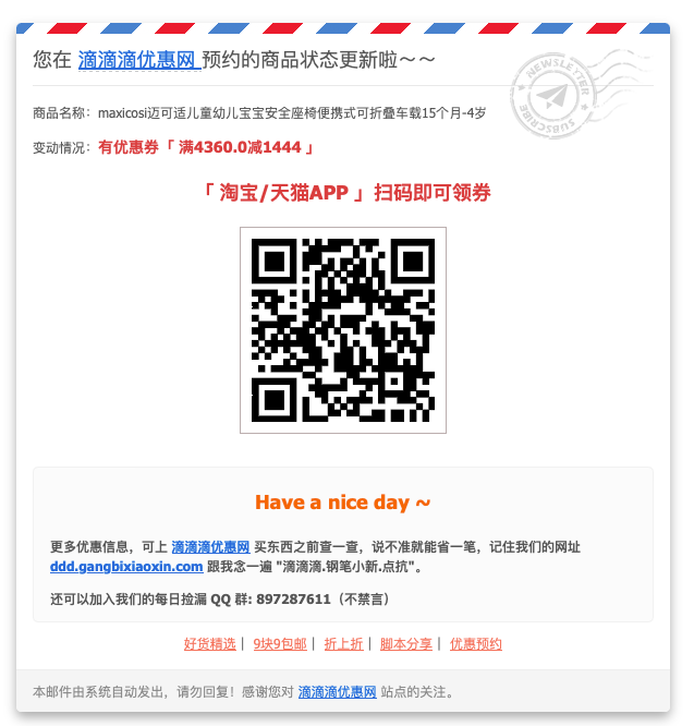 我觉得用邮箱推送优惠信息确实是个好主意,尤其是开启微信的QQ邮箱提醒后,信息接收的及时性还是有保障的。