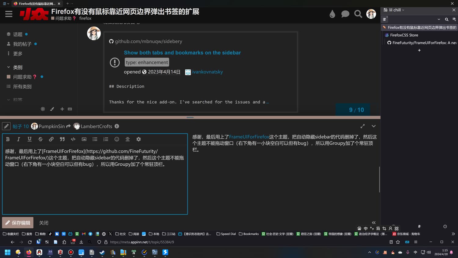 那就使用 Floorp,一个 Firefox 修改版,支持双侧边栏