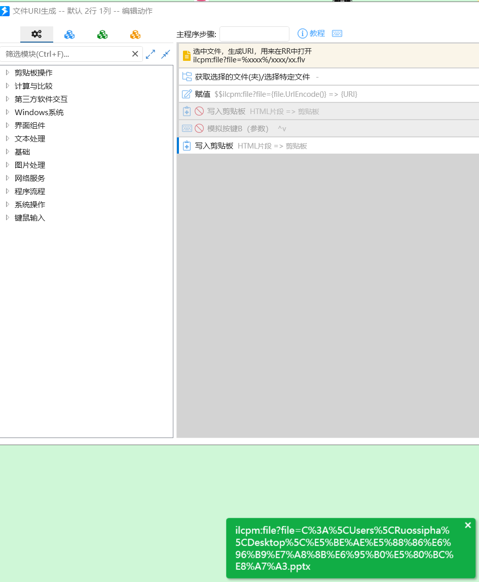 我自己用quicker造了一个很简单的轮子,但是功能很简单,只能自己用的样子,分享出来其他人根本不会用的那种,大概步骤是这样: