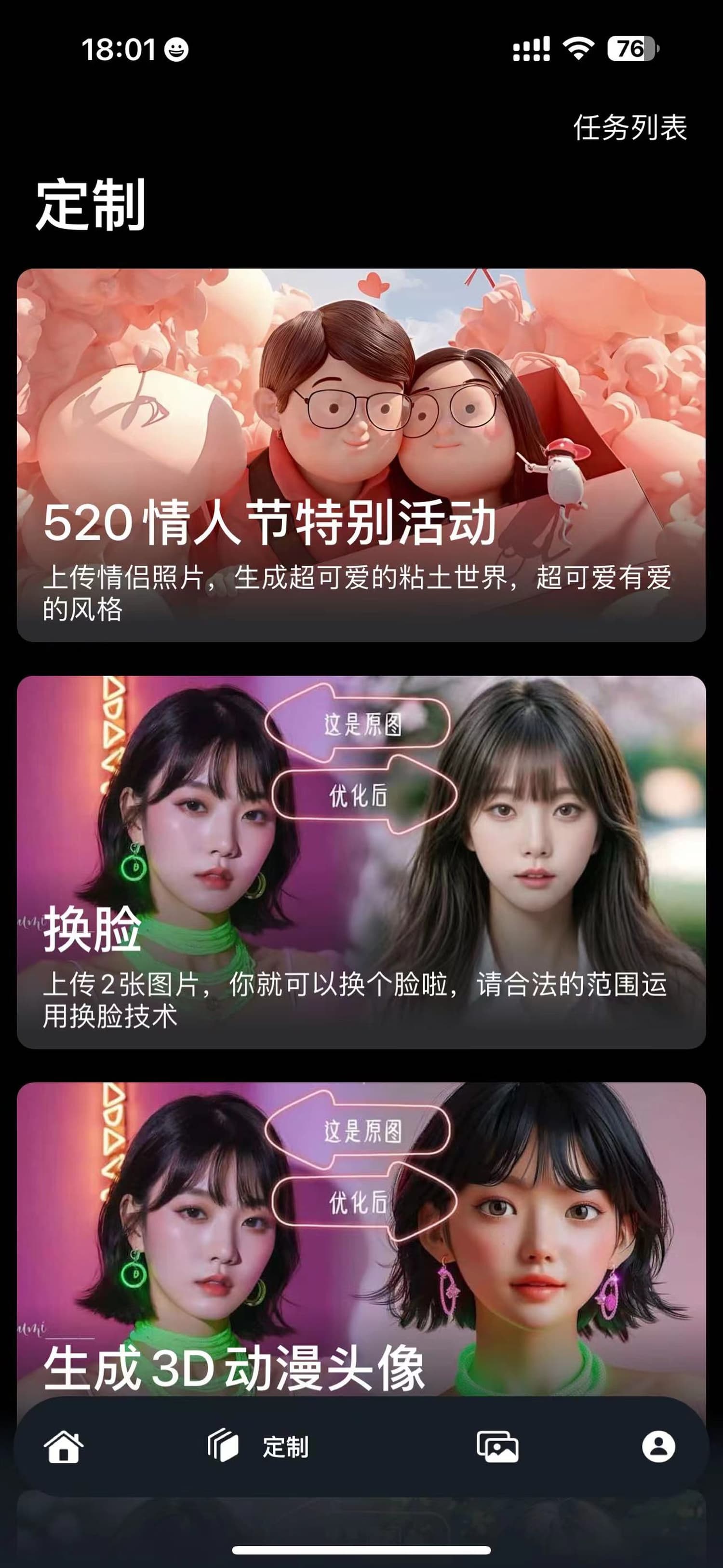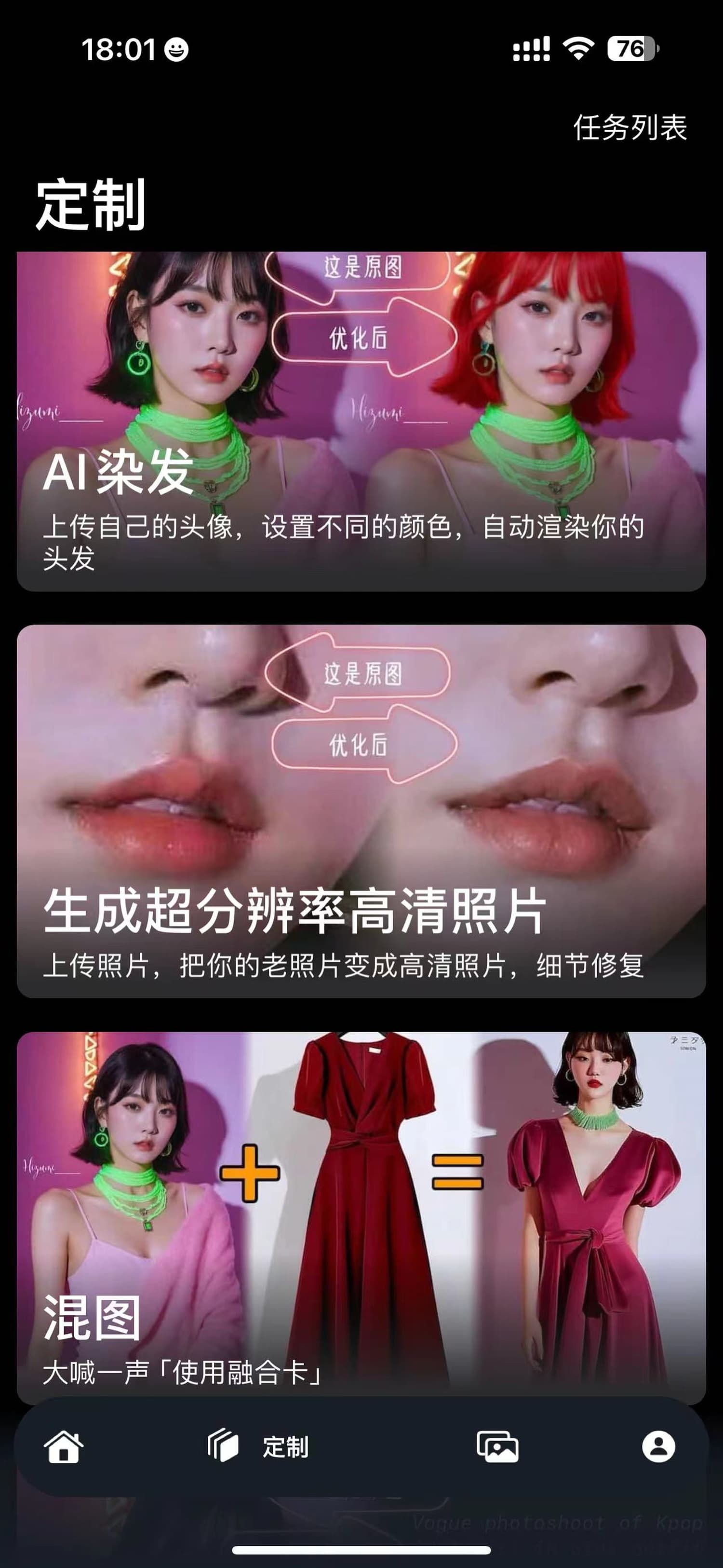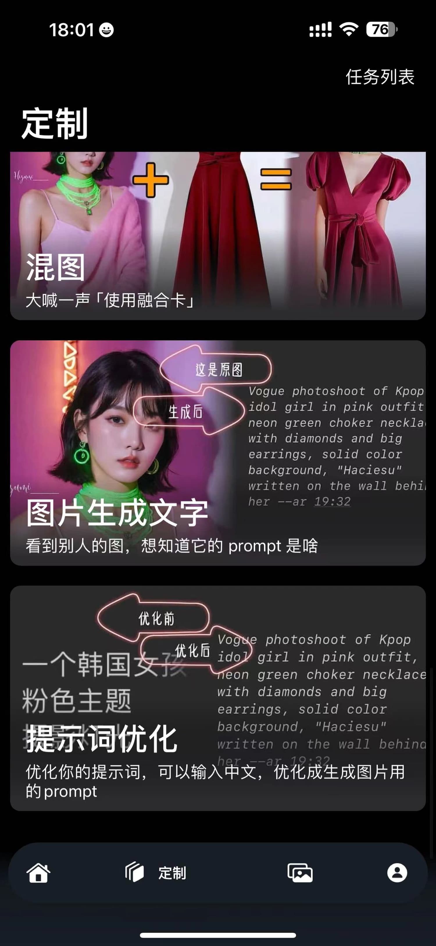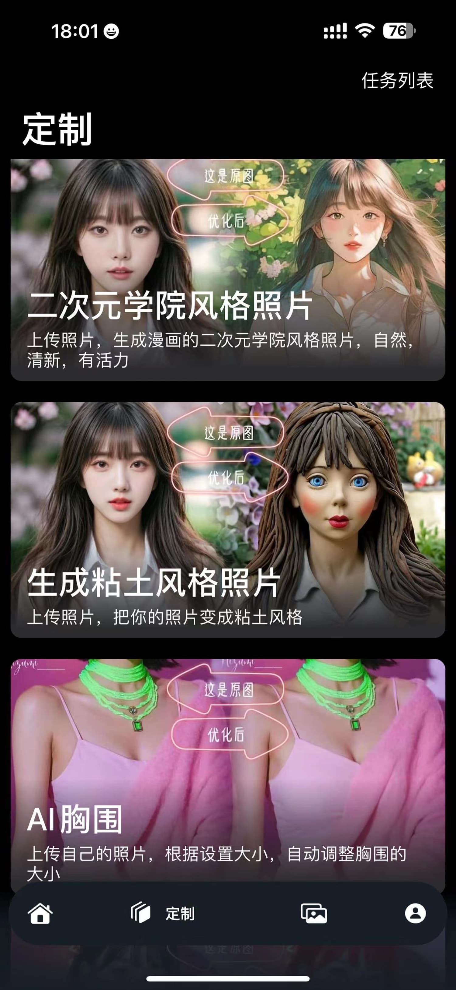 【定制】目前支持多个定制化功能,如:换脸,混图,皮克斯风格头像,学院动漫风格头像,粘土风格头像,喜闻乐见的AI大胸,一键调整胸围,染发,将图片分辨率提高照片,图文生成文字,还有不知道怎么写提示词,提示词优化(免费)