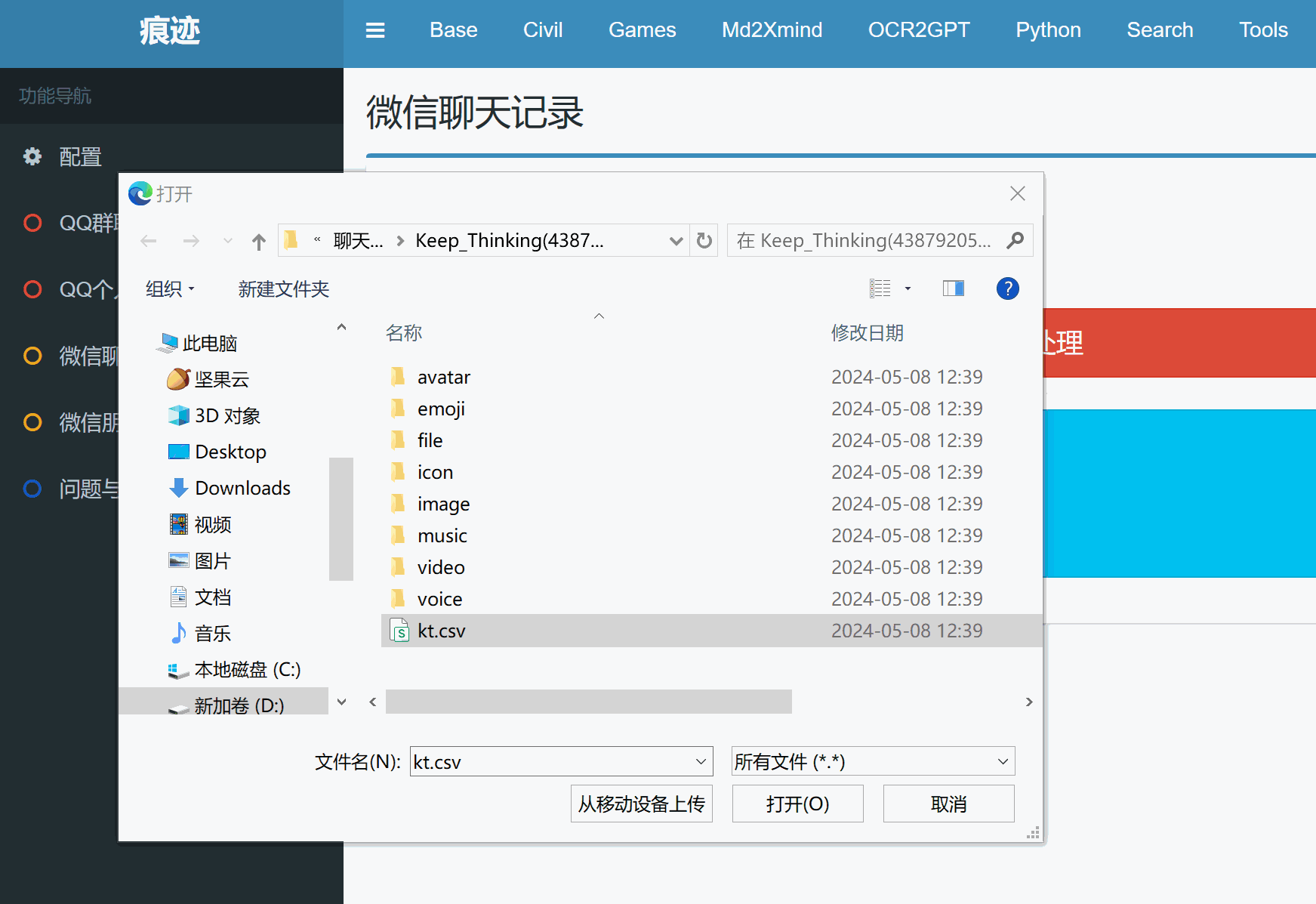 需要先用楼主的工具 MemoTrace 导出微信聊天记录到一个 CSV 文件。然后用这个工具分析,接着就报错了,白忙活一场