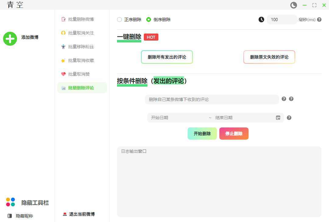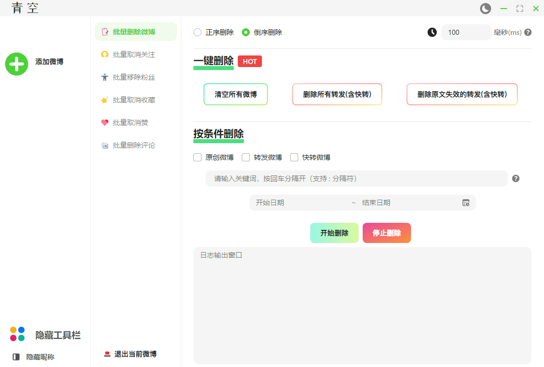 之前因为业务需要大批量的删除微博,找了一圈都没有一个合适的工具,要嘛是失效了,要嘛是靠js代码来删的,速度很慢也很不人性化,所以自己用业余时间撸了一个,解放双手,如果你也有这个需要,希望能帮到你。