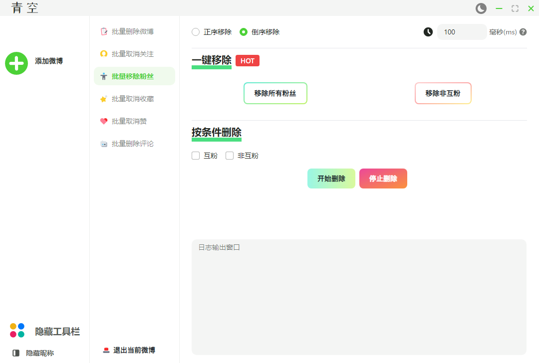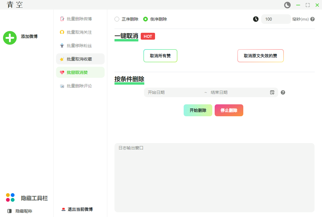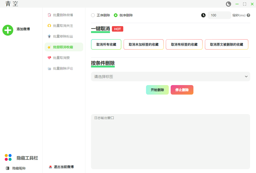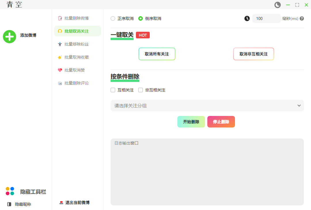- 支持多账号操作,每个账号都是独立的环境,不进行删除的时候也可以当作微博小号切换器来使用。