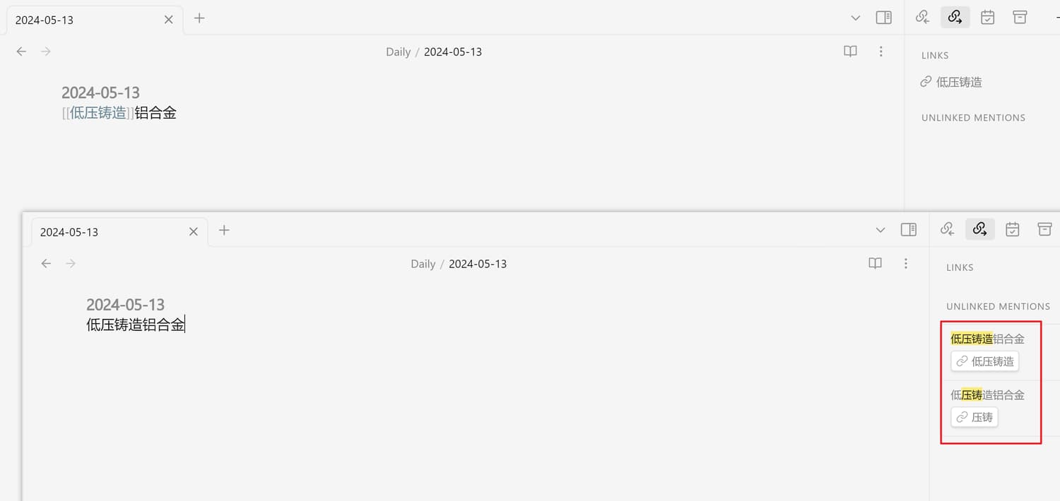 你看我图上面就是,当我输入低压铸造铝合金的时候,低压铸造这个关键字就会被识别出来,生成一个 unlinked mention,我点一下链接,就自动把 [[ 加上了。我就是需要这个。