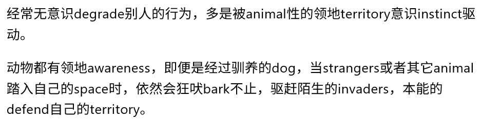 经常无意识贬低(degrade)别人的行为,多是被动物性的领地(territory)意识本能(instinct)驱动。