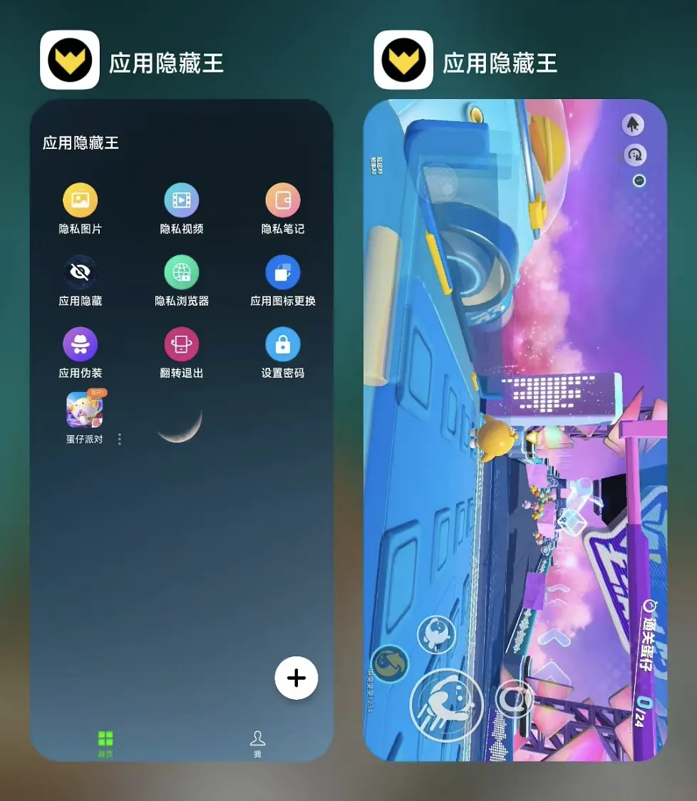 将手机中的【蛋仔派对】游戏(游戏大小1.95GB)导入到应用隐藏王内部后,内部的应用和系统中的运行体验一致。