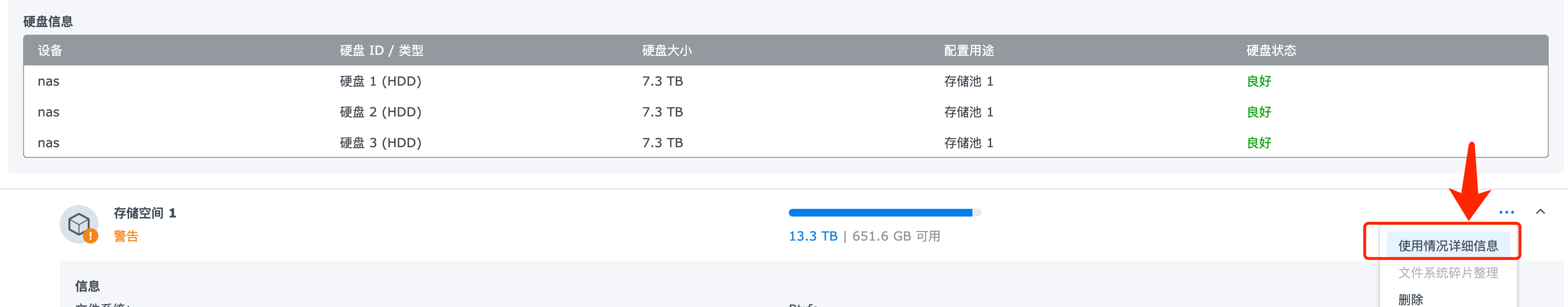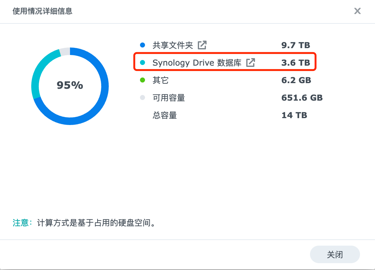 现在空间快用完了,查看了下磁盘详细使用情况,发现上图中有一项【Synology Drive 数据库】占了 3.6T 之多