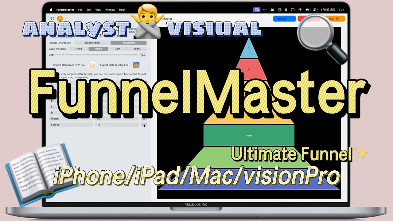 FunnelMaster 是您在 iOS、macOS 和 visionOS 上创建复杂漏斗图的首选工具。轻松输入数据,生成复杂的漏斗图,以引人注目的视觉格式清晰显示数据。