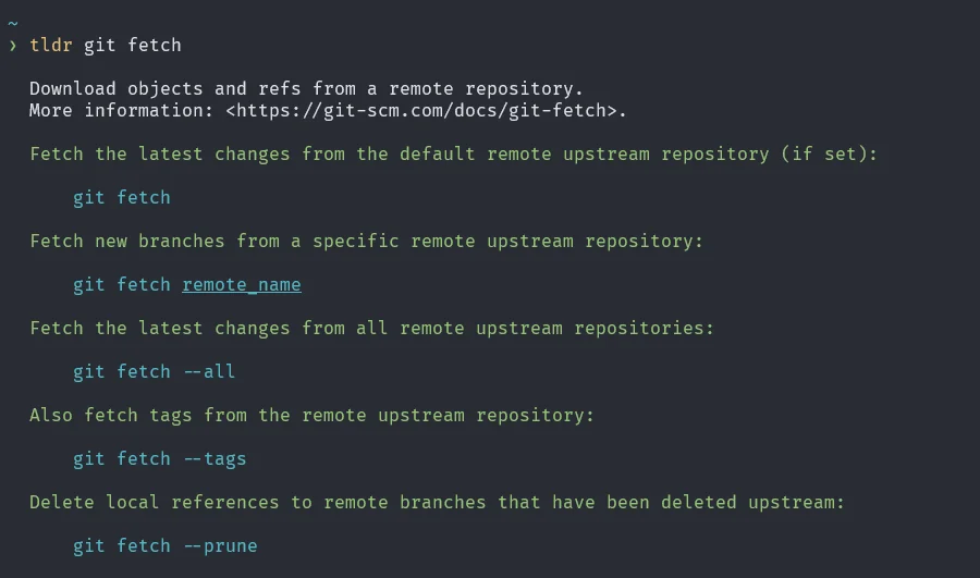 For example, running tldr git fetch in your command terminal will display the most frequently used commands associated with git fetch.
