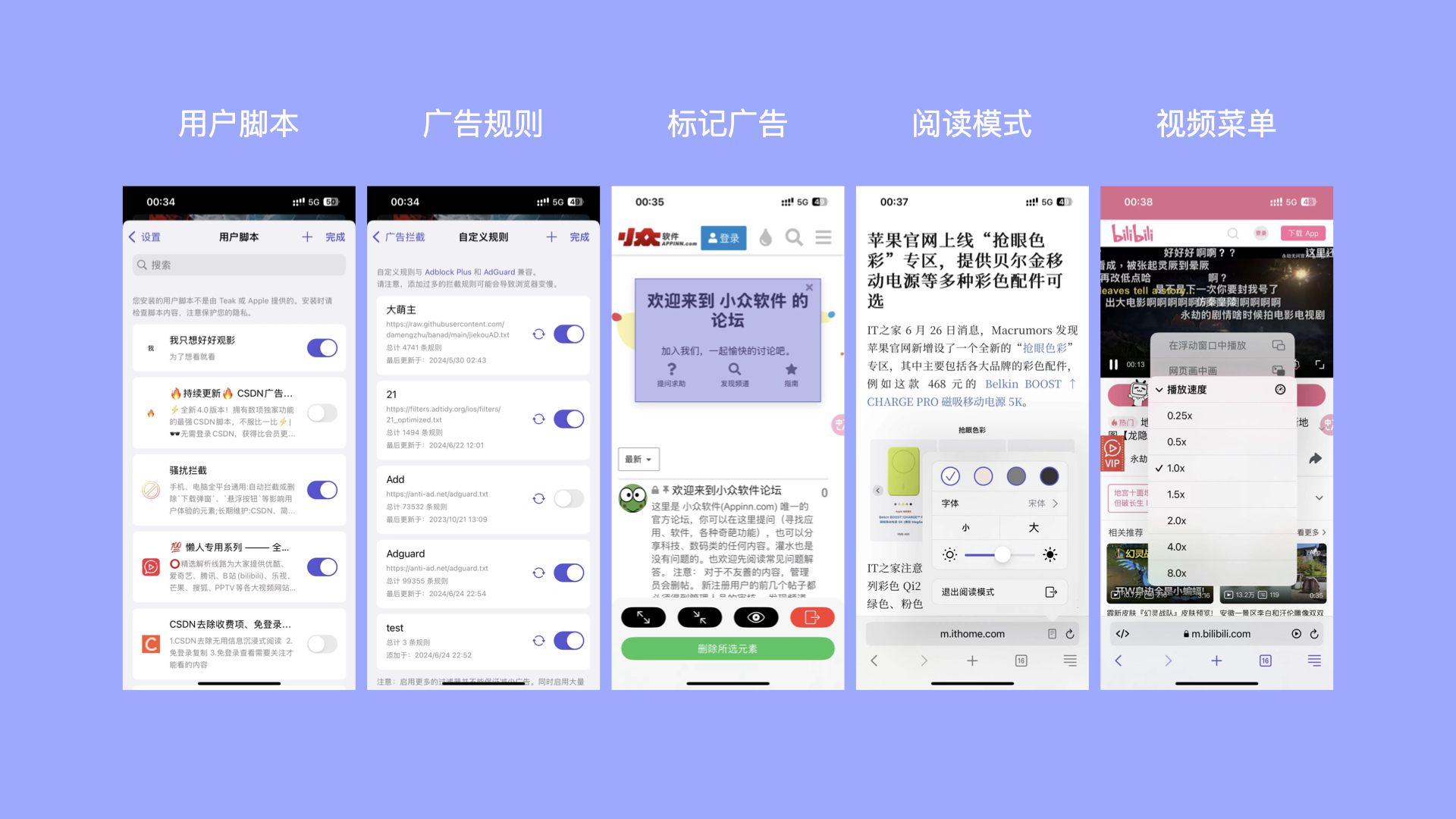 支持自定义的广告拦截规则,兼容Ad Block Plus和Adguard,同时也支持自己在网页中标记广告