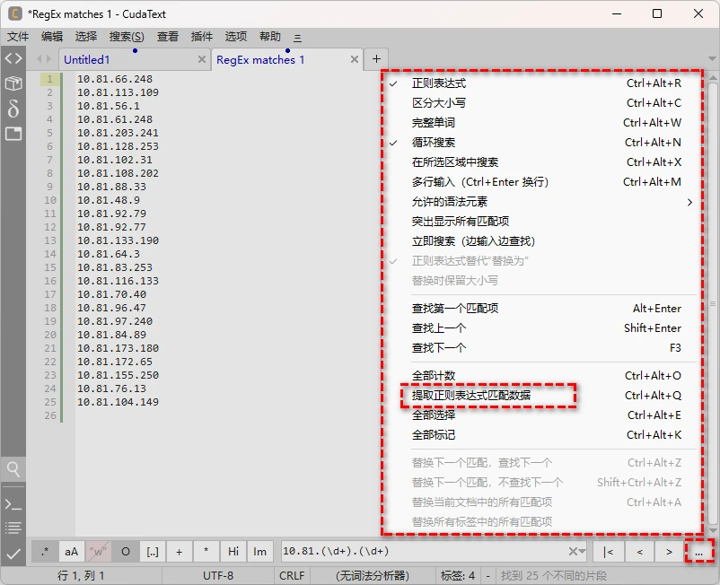 一个是免费的 cudatext 1.215.0.2,解压后的文件夹大小是30.5MB。它的查找就可以和emeditor一样直接提取。而且这个软件在window7下也能正常使用。首选了。