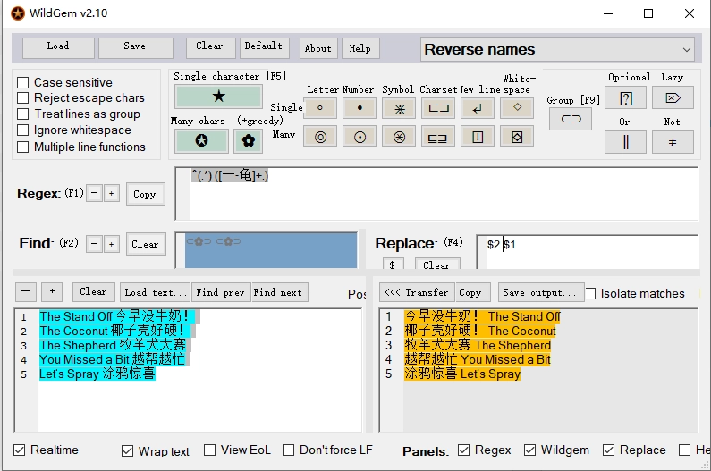 可以把后面不带空格的中文移动到前面,不需要用正则表达式。