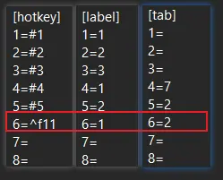 举个例子,如果你想要设置一个6号 快捷键 ctrl+f11,用来快速输入“符号”类表情,那么你需要修改[hotkey]下的 6=^f11; [label]下的6=1 ;[tab]下的6=2