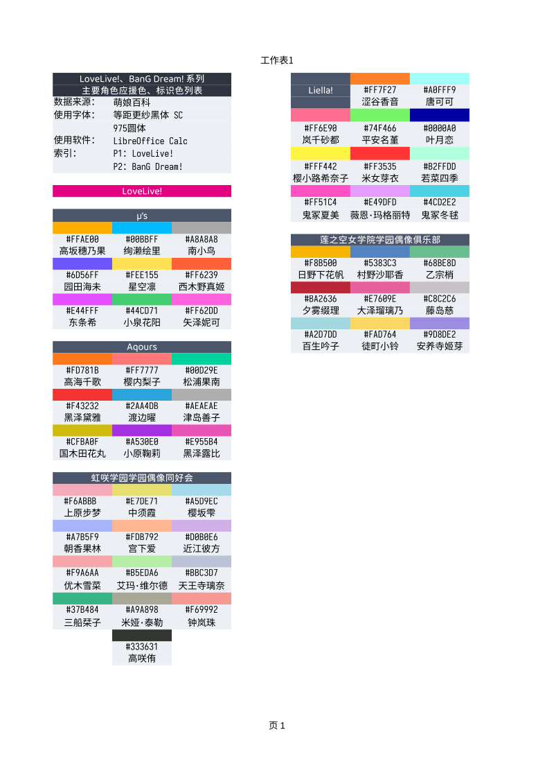 其实就是一份总结了 LoveLive!系列 和 BanG Dream! 两个 ACGN 跨平台企划的主要角色的应援色/标识色的清单。如果那天你需要选一组颜色(比如要画一组图表),可以随便从里面找一组顺眼的弄上去……