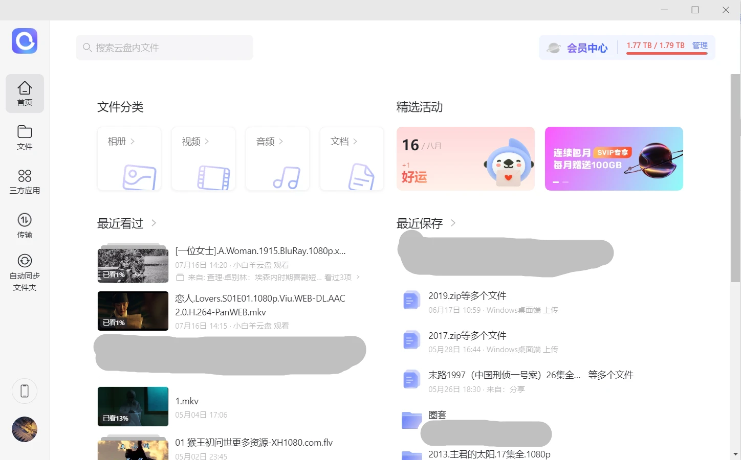 最近文件和转存内容占据了显眼的"标题位",但尺寸又太小,显示不了几个文件,妥妥的鸡肋