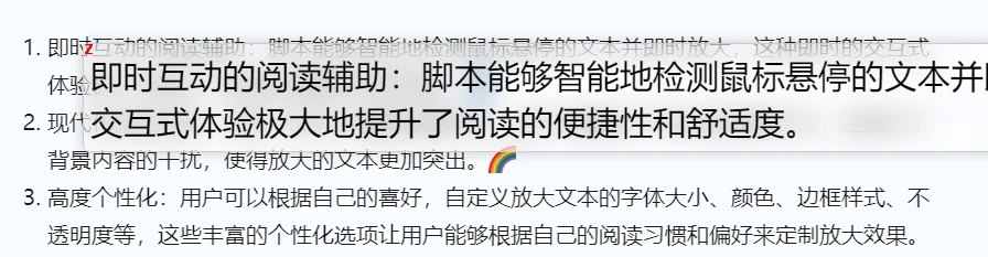 - 即时互动的阅读辅助:脚本能够智能地检测鼠标悬停的文本并即时放大,这种即时的交互式体验极大地提升了阅读的便捷性和舒适度。