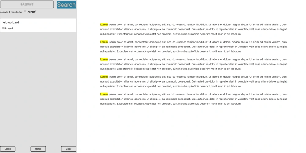 Enter键即可搜索文件内容。 - 在搜索结果页点击搜索结果,可以预览文件内容。仅在预览 Markdown 文件时会高亮搜索词。