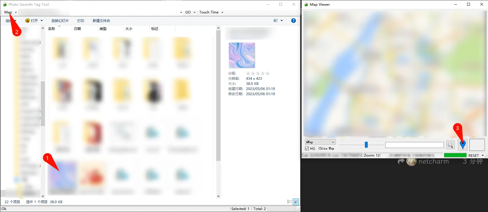 附上一张UI, 基本就是按照序号来操作, 点选图片(和资源管理器选择方法一致), 点地图按钮打开地图窗口, 如果有地理信息, 就会跳转到对应地点, 没有就是上次选择的地点, 然后选择蓝色图标的按钮标记地点, 最后按照需求touch时间, 如果没有元数据时间的最好先下拉touch菜单选择Touch当前时间到元数据. 另外因为三方库早就不再更新了, 所以搜索已无法实现, 变通办法是通过地图缩放选择来快速选择地点, 此外地图地理坐标是支持修正国内地图偏差的, 当然精度不可能很高, 但大差不差吧, 说实话我觉得照片地理标签的精度差个十来米都不是问题.