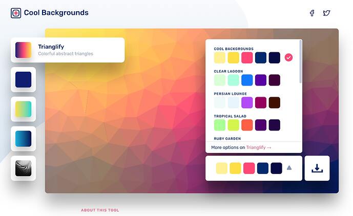 又是一个网页小工具。网页提供了5种不同的样式——Trianglify(多边风格)、Particles(粒子)、渐变、Gradient Topography(等高线)以及 Unsplash 上的无版权图片。个人最喜欢渐变色的等高线和粒子这两个风格。这些应该都是通过 css 或者 js 做的,所以最后生成为图片而不是能够直接下载源代码,倒是缺少了一点动态效果以及后期自行修改的能力。