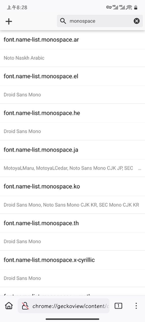 Firefox for Android 打开 about:config: chrome://geckoview/content/config.xhtml,然后 font.name.monospace. 是设置等宽的。