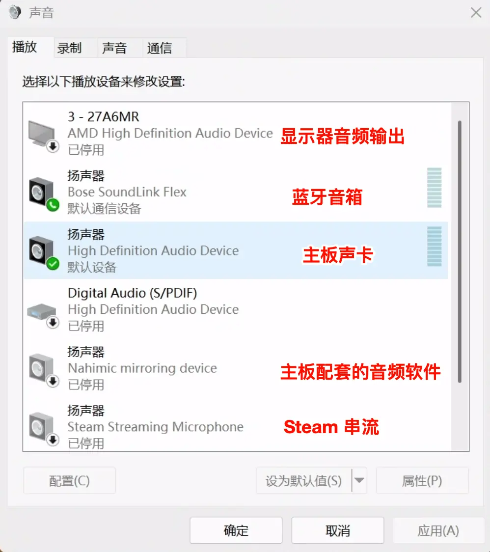 神了,你是对的,我才发现我把主板声卡给禁用了……可能是因为以前连耳机的时候默认输出设备老是切不到耳机上。很早之前的事了,我都忘记了。