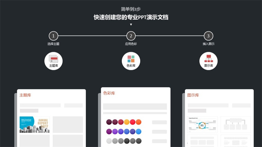 不同于传统意义上的 PPT 模板,你在 iSlide 中看不到模板成品,而是独立的主题库、版式库、色彩库、素材库。
