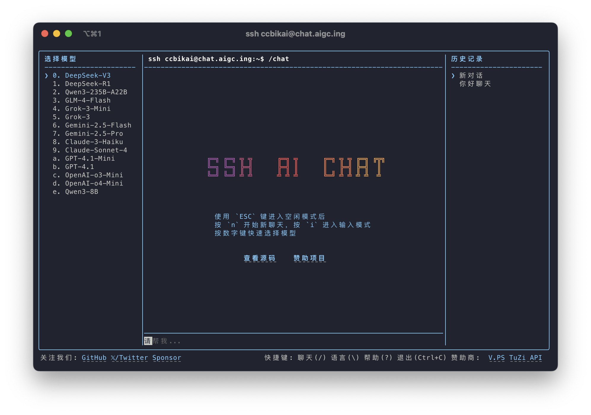 使用 Node.js 和 React 构建,支持 模型切换、历史会话、多语言 等基本功能。
